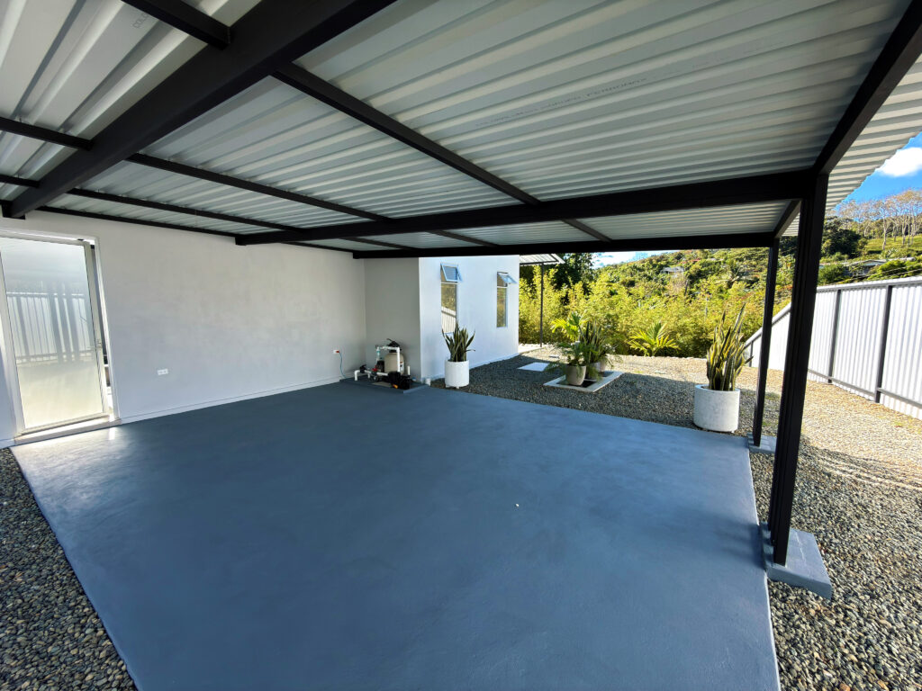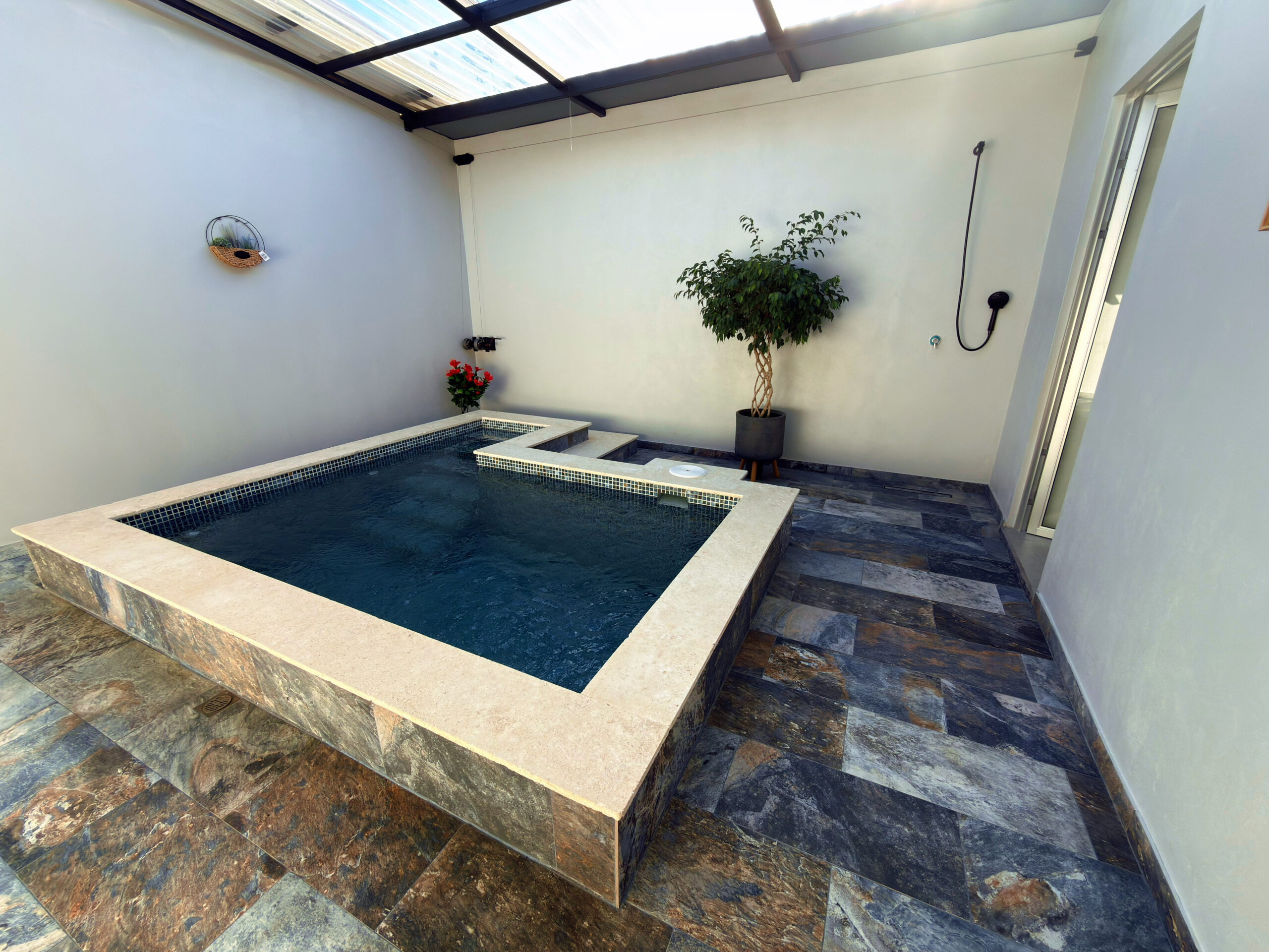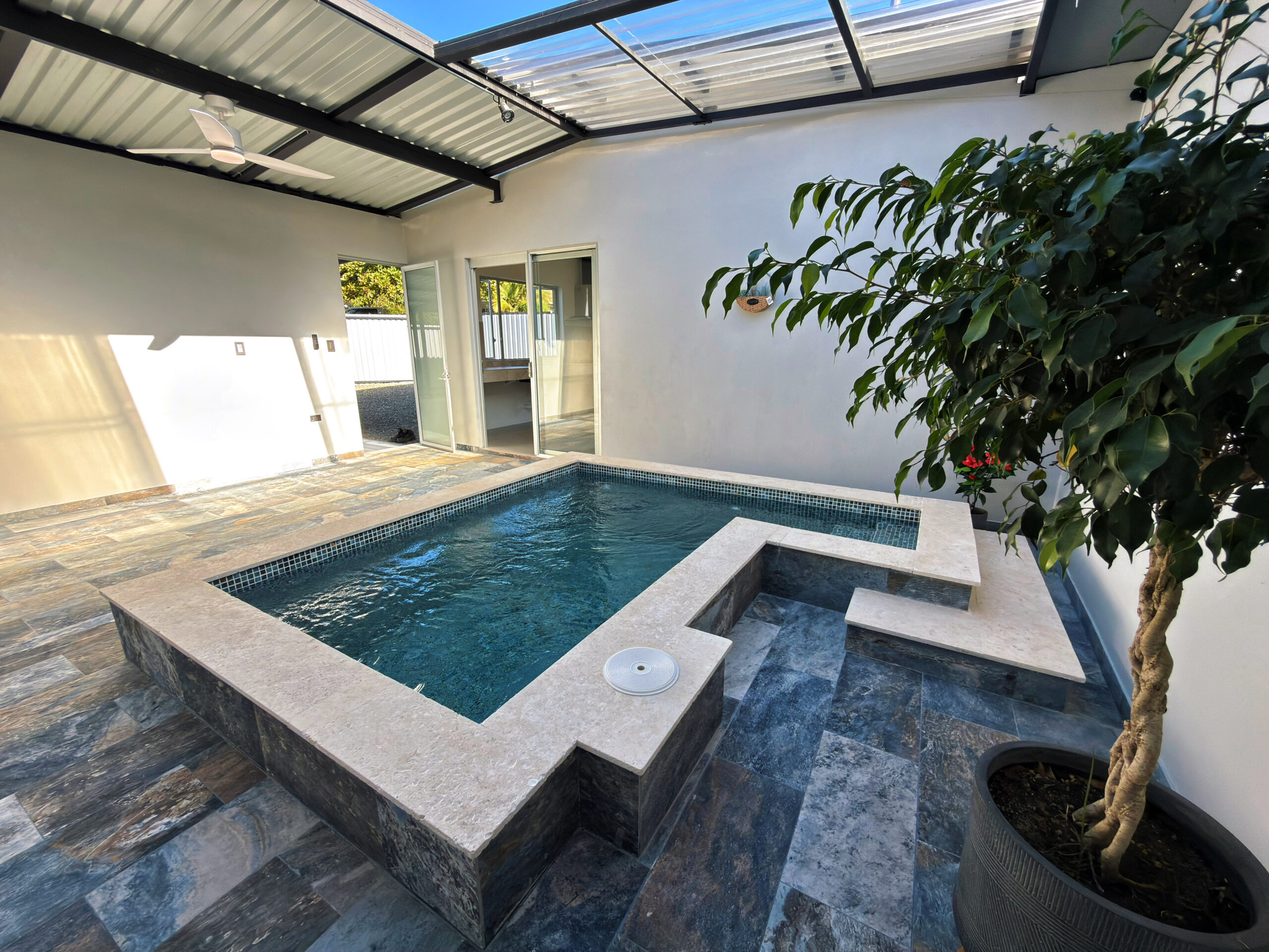 EXTERIORES: Piscina interior con techo retráctil, parqueo para 2 vehículos y lote de 322 m² con potencial para expansión.