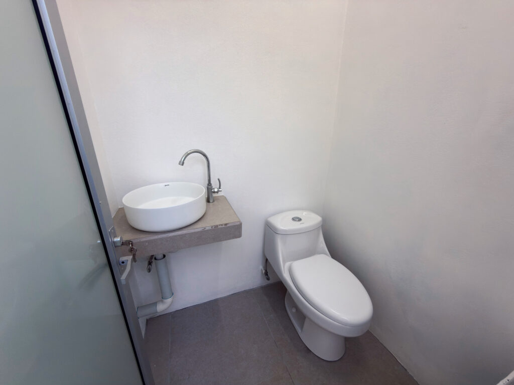 ÁREAS SOCIALES: Sala, medio baño y cocina equipada con mobiliario empotrado y extractor de grasa.